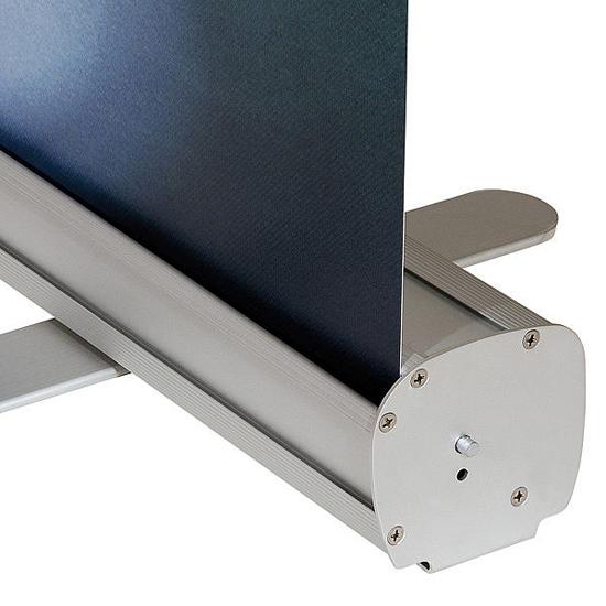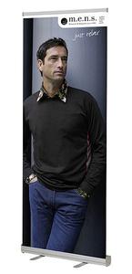 RollUp banner je ekonomický prezentační bannerový systém. Je vhodný pro krátkodobé akce produkčního charakteru. Grafický panel se vlepuje na zaváděcí pás v kazetě a na horní hraně se svírá do hliníkového profilu. Šíře 85 cm, výška 200 cm. materiál hliník, barva stříbrná. Lze jednoduše poskládat do brašny (součást dodávky).
