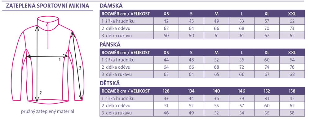 Dámský i pánský střih. Zateplená sportovní mikina (z vnitřní strany česaný polyester). 2. funkční vrstva. Individuální celopotisk se provádí sublimačním tiskem. Základní barva Zipu je černá (jiná barva za příplatek 10%). Možnost potisku fluo barvami. Standardní velikosti XS-XXL včetně standardních dětských velikostí.